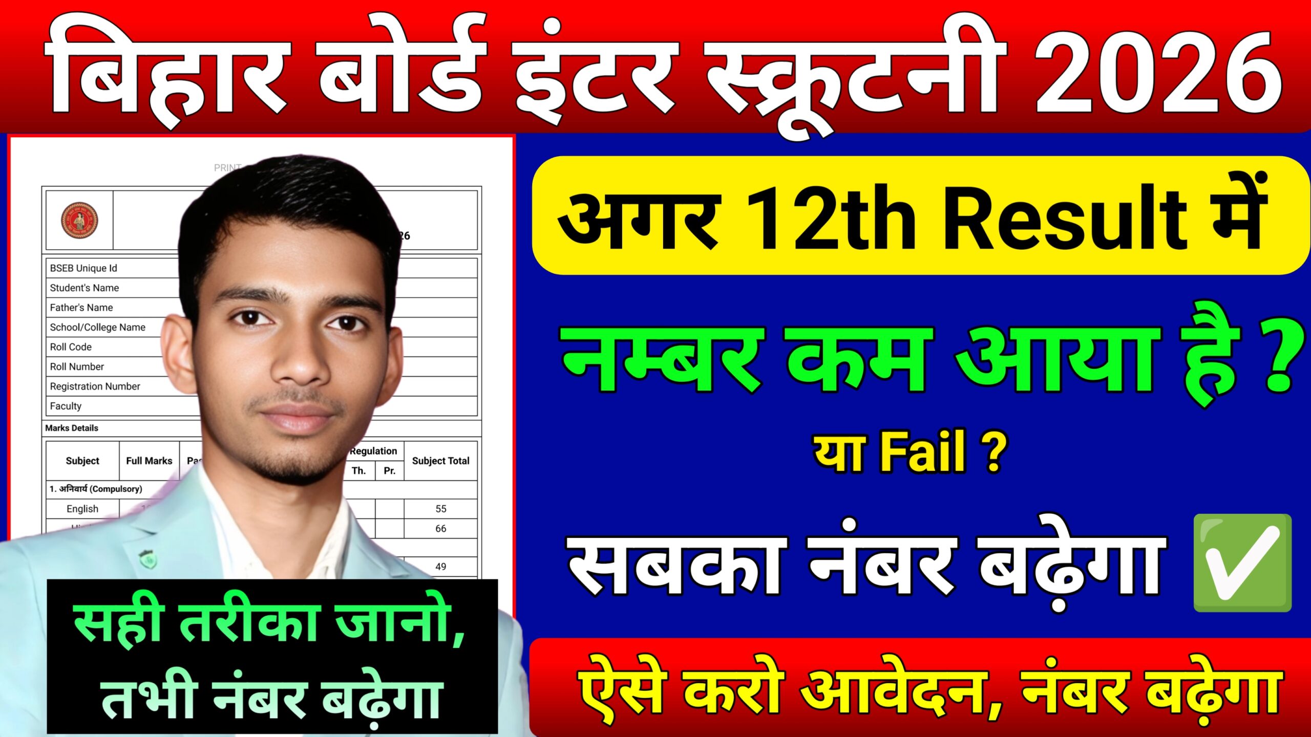 यदि आप बिहार बोर्ड इंटर परीक्षा 2026 में शामिल हुए थे। लेकिन आप इस परीक्षा के रिजल्ट से आप खुश नहीं है। तो आप 25 मार्च 2026 से ऑनलाइन आवेदन शुरू कर दिया गया है। 02 अप्रैल 2026 तक स्क्रूटनी के लिए ऑनलाइन आवेदन करके अपना कॉपी Recheck करवा सकते है।